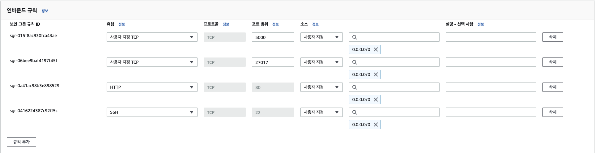 포트번호를 열어주는 과정입니다. 특히 mongoDB의 경우 27017 포트번호를 사용하기 때문에 해당 포트를 열어줘야 외부에서 데이터 적재를 위한 접근이 허용됩니다.